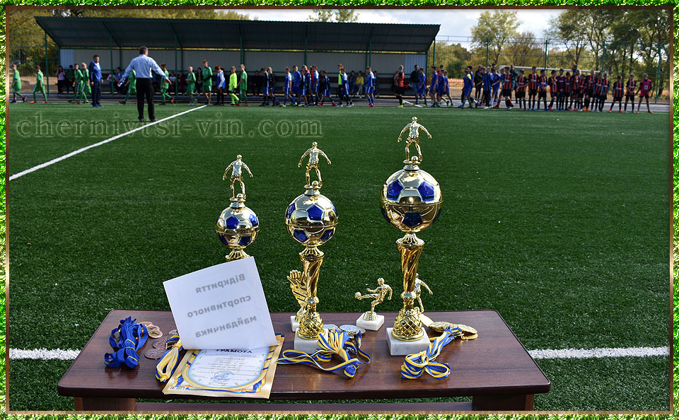 штучне футбольне поле, смт Чернівці золоті кубки для призерів у Чернівецькому районі футбольні золоті кубки для нагородження, район Чернівецький Олена Віталій Бень, відкриття спортивного майданчика, Чернівецький район