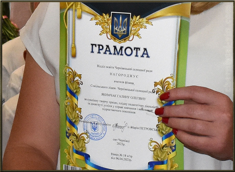 нагородження грамотою, Сокільська школа, Чернівецька територіальна громада вручення грамоти, Якимчак Галина, с.Сокіл