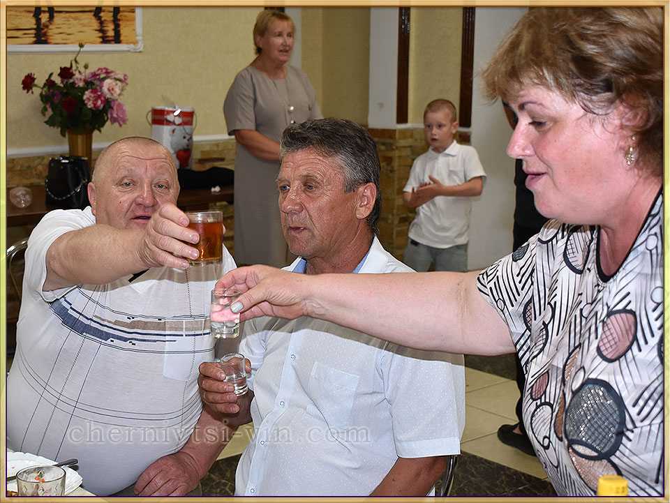 за святковим столом, Чернівецький район 1923-2020 Михайло Мацюк і Петро Шульга, смт Чернівці Ніна Мельник виголошує тост, селище Чернівці вітальний поцілунок, селище Чернівці