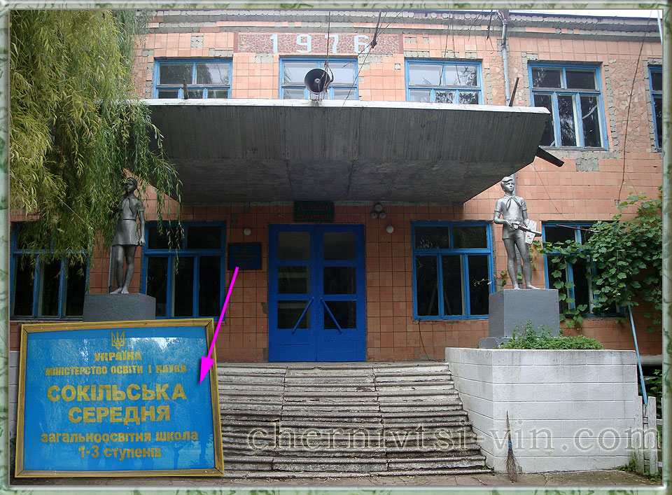 скульптури, школа в селі Сокіл Чернівецького району скульптури біля школи, с.Сокіл у Чернівецькому районі Сокільська школа