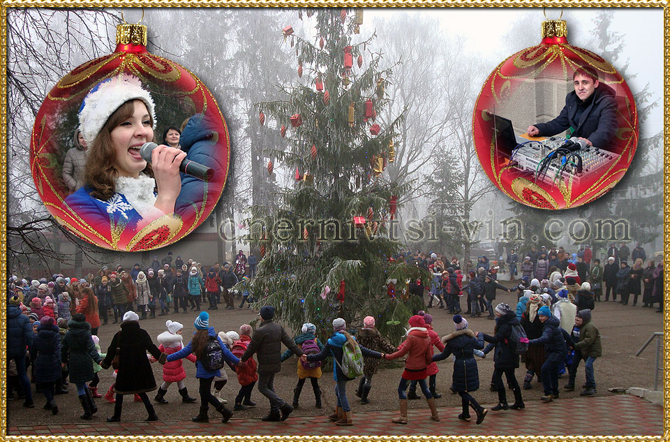 святкове дійство на відкритті новорічної ялинки, смт Чернівці, Чернівецький район Дід Мороз і хоровод навколо новорічної ялинки, смт Чернівці у Чернівецькому районі