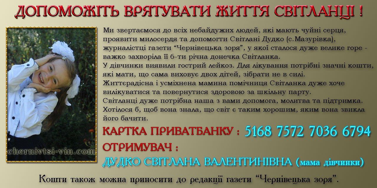 Чернівецький район сколихнула жахлива новина про біду, що сталася в родині журналістки районної газети "Чернівецька зоря" Світлани Дудко. Її 6-річній донечці Світланці лікарі поставили страшний діагноз – гострий лімфобластний т-клітинний лейкоз – рак крові. Наразі дитина знаходиться на лікуванні у онкогематологічному відділенні Вінницької обласної дитячої лікарні. Потрібні чималі кошти на лікування Світланки. Зараз дівчинку готують до першого курсу хіміотерапії, а це 5-8 днів цілодобової крапельниці. Сьогодні відбулася чергова благодійна акція з метою збору коштів на лікування Світланки. За два дні концертів зібрано 16914 гривень. Це невелика сума в порівнянні з тим скільки буде ще потрібно. Велика подяка усім тим, хто долучився до підтримки маленької дівчинки. |