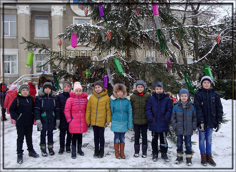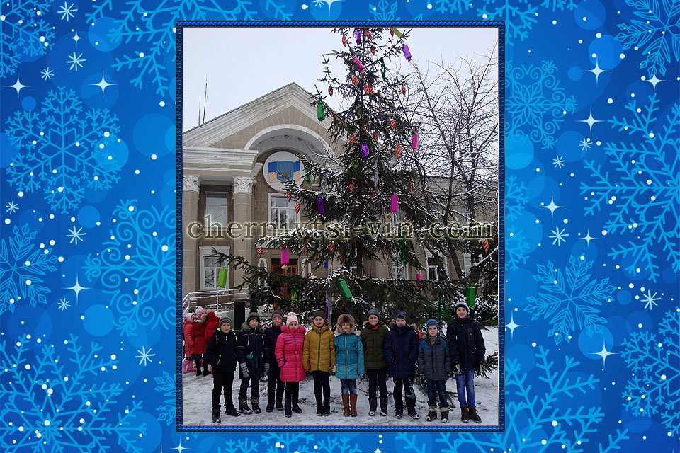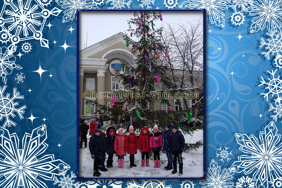 головна ялинка Чернівецького району діти біля новорічної ялинки, район Чернівецький фотографія біля новорічної ялинки в смт Чернівці Новорічна ялинка у Чернівецькому районі