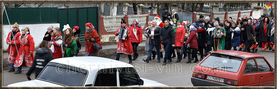 колядники з села Біляни на районному фестивалі Різдвяна зірка, смт Чернівці, Чернівецький район різдвяний вертеп, селище Чернівці, район Чернівецький фестиваль Різдвяна зірка смт Чернівці Чернівецького району колядники, вертеп, Чернівецький район колядники прямують до Універмагу фестиваль Різдвяна зірка смт Чернівці