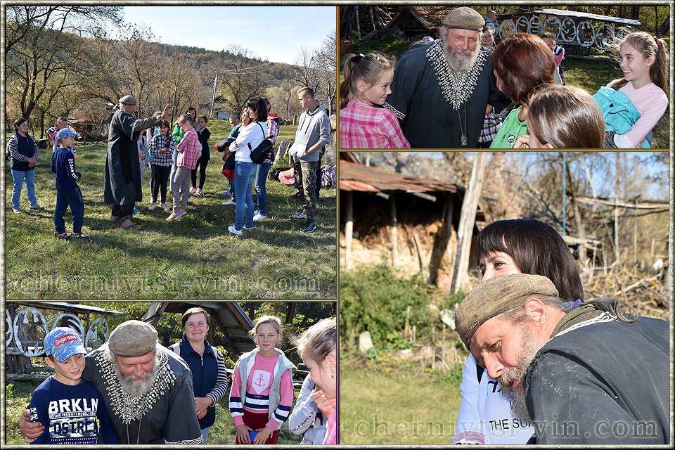кам'яні скульптури Олексія Михайловича Альошкіна, село Букатинка, район Чернівецький Олексій Альошкін спілкується зі школярами Наталя Олександрівна Кіур Макогончук з Олексієм Альошкіним, с.Букатинка