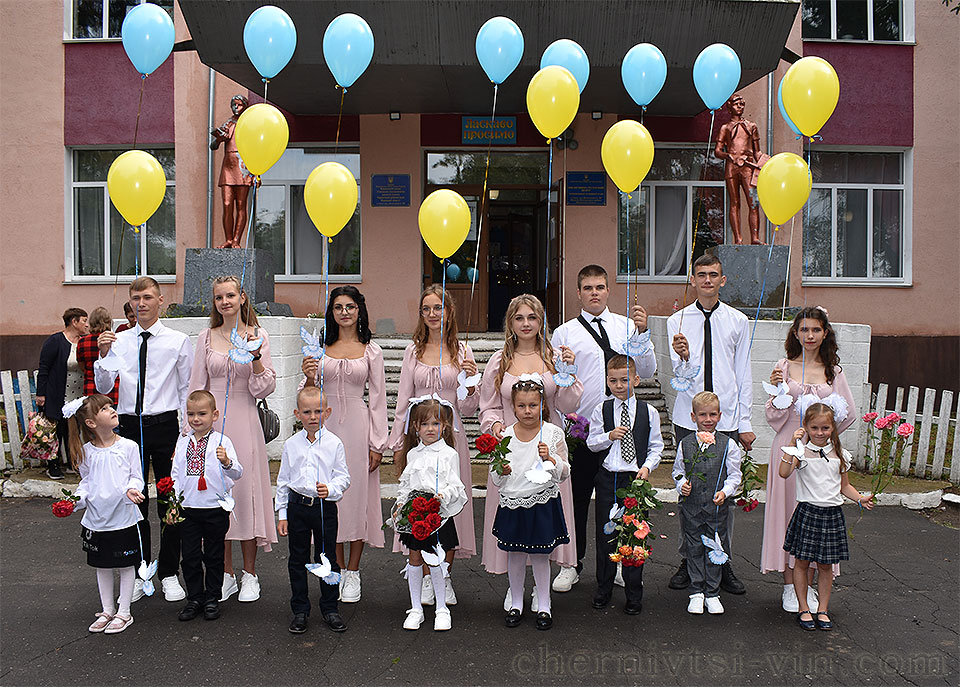перше вересня, Сокільський ліцей, Чернівецька селищна рада школярі в Сокільському ліцеї Чернівецької громада Сокільська школа, Чернівецька громада кульки в небі, Сокільський ліцей папуга на дереві, Чернівецький район 1923 - 2020 Даша Шульга, село Сокіл, Чернівецька громада Оксана Іванівна Шульга, с.Сокіл свято 1-ше перше вересня, с.Сокіл, Чернівецька селищна рада перший дзвоник, школярі йдуть школярі несуть квіти, с.Сокіл