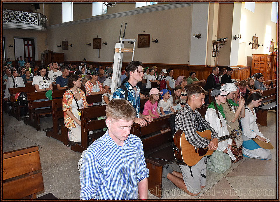 гітарист, смт Чернівці Паломництво Томашпіль - Летичів, смт Чернівці костел святого Миколая в смт Чернівці, Чернівецький район 1923-2020 молитва в костелі, смт Чернівці бейдж паломника дівчата-паломники, смт Чернівці, Чернівецький район