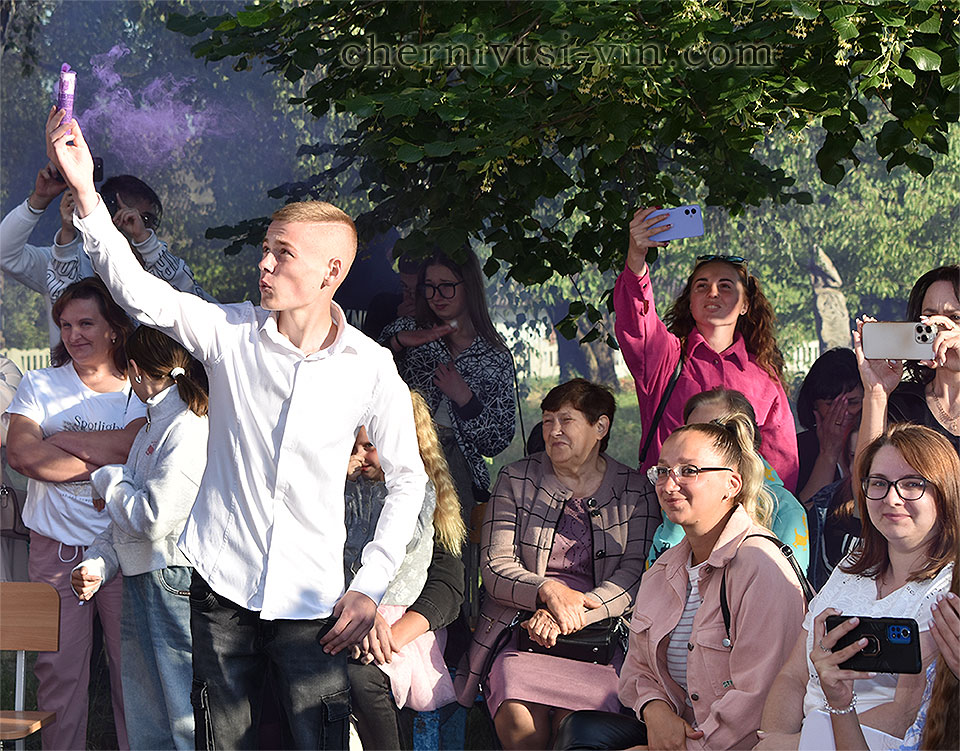 випуск-2025, Чернівецька громада глядачі на випускному вечорі бал випускників Сокільського ліцею випускники тримають вазони, с.Сокіл