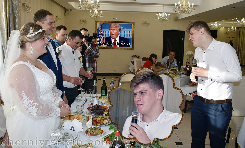 весільне фото на пам'ять на весіллі Олесі Рущак весілля, Олеся Рущак, гірко Наталя Михайло Рущак, село Сокіл Чернівецького району Артем Рущак вітає Олесю святковий тост за наречених