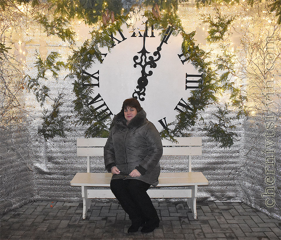 смт Чернівці вночі, Чернівецька громада різдвяна площа, смт Чернівці різдвяні вогні, смт Чернівці, Чернівецька громада різдвяні вогні, Чернівецький район Новорічна ялинка, Чернівецький район 1923-2020, Вінницька область новорічний годинник, Чернівецька громада новорічні вогні, смт Чернівці Тетяна Череменко, Чернівецька громада Тетяна Олексіївна Череменко, смт Чернівці новорічне фото жінка біля ялинки в Чернівецькому районі
